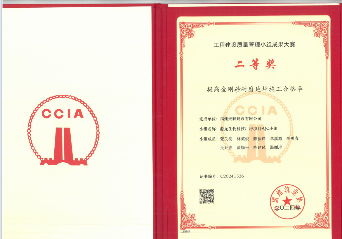天映建設(shè)源龍生物科技廠房項(xiàng)目QC小組榮獲二等獎