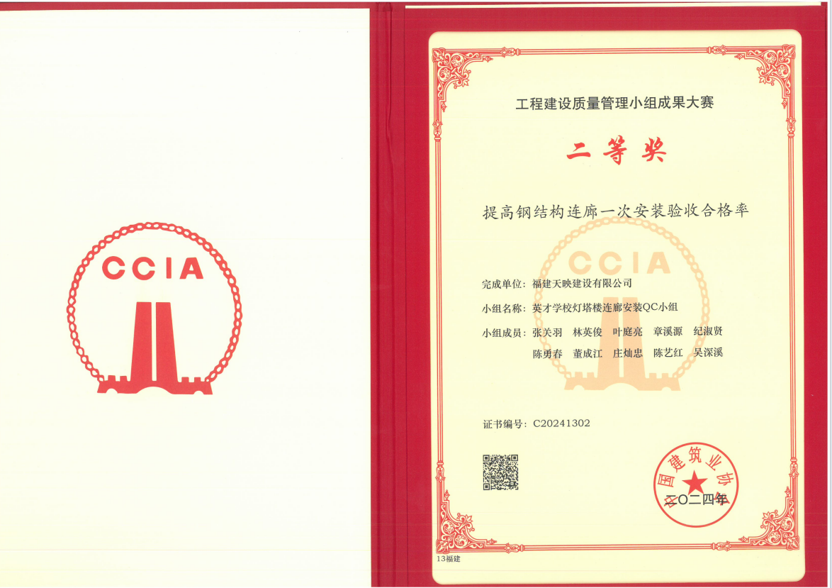 天映建設(shè)英才學(xué)校燈塔樓連廊QC小組榮獲二等獎(jiǎng)