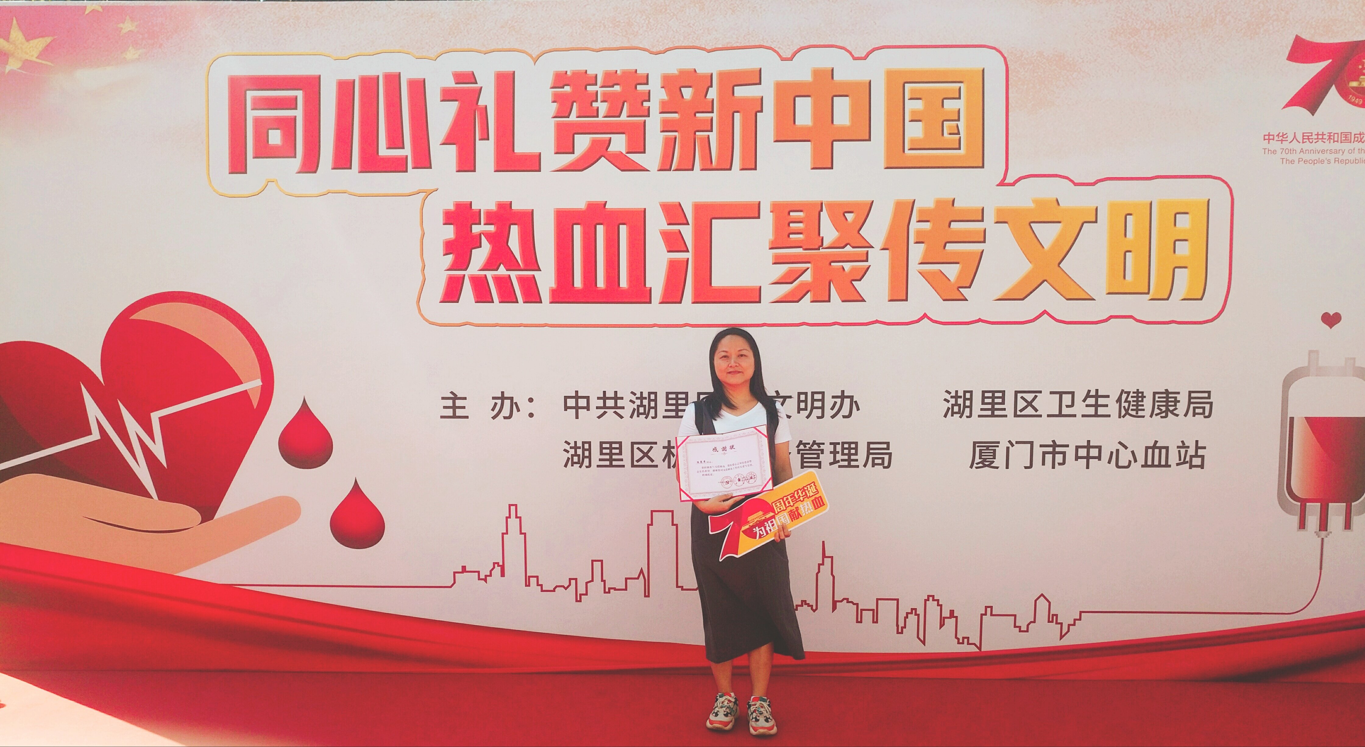 2019年9月19日上午,區(qū)委文明辦、區(qū)衛(wèi)健局、區(qū)機(jī)關(guān)事務(wù)管理局在區(qū)行政中心東附樓機(jī)關(guān)食堂南門前,開展湖里區(qū)“同心禮贊新中國、熱血匯聚傳文明”無償獻(xiàn)血活動(dòng)。